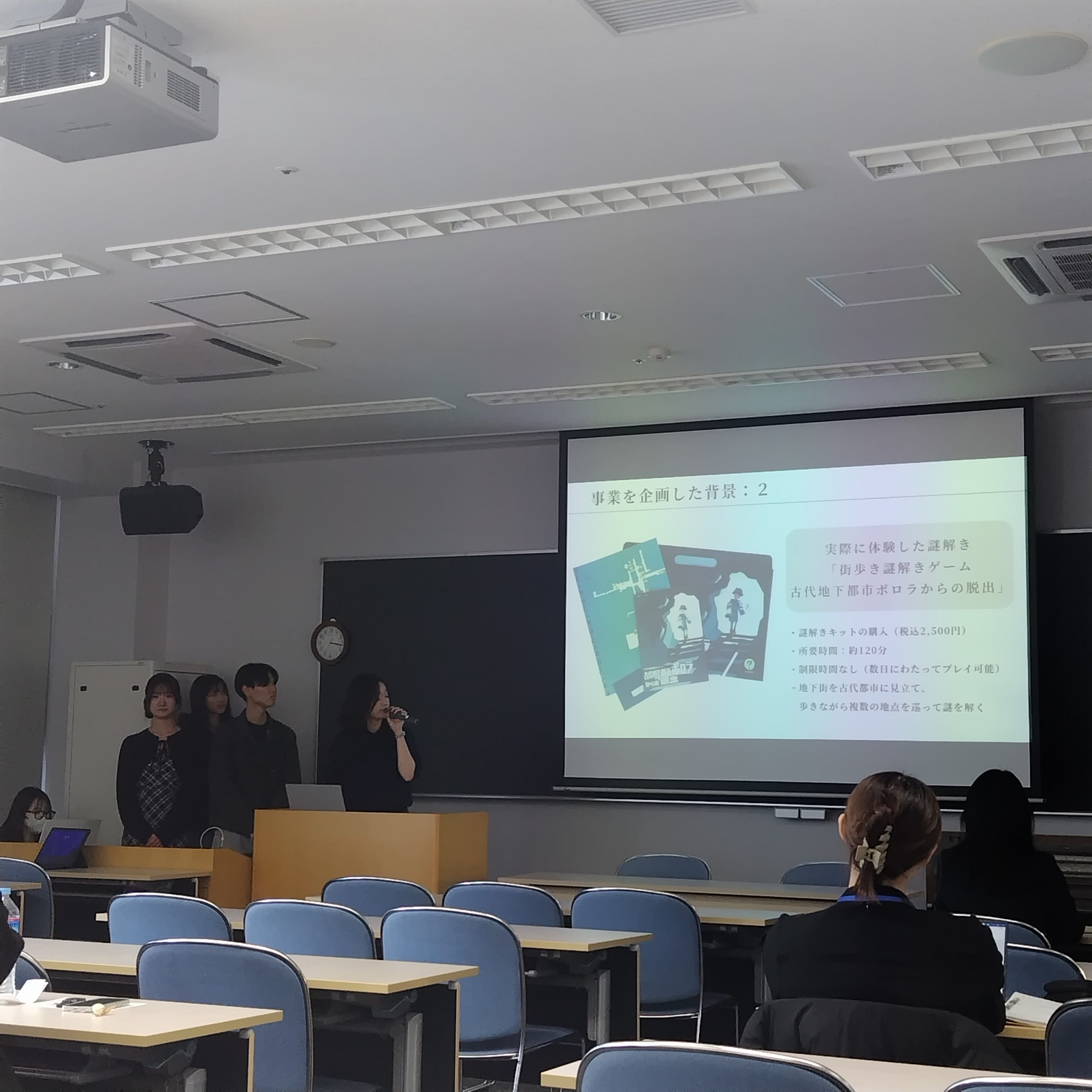 報告会では、2グループから当別町内周遊促進の提案を行いました。フィールドワークを行う中で、得た発見や知見から、「町内を舞台としたなぞときイベントの実施」「お菓子のパッケージデザイン作成による地域の活性化」の提案を行いました。提案した内容については、今後、学生達が実際に実施が可能か検討していきます。