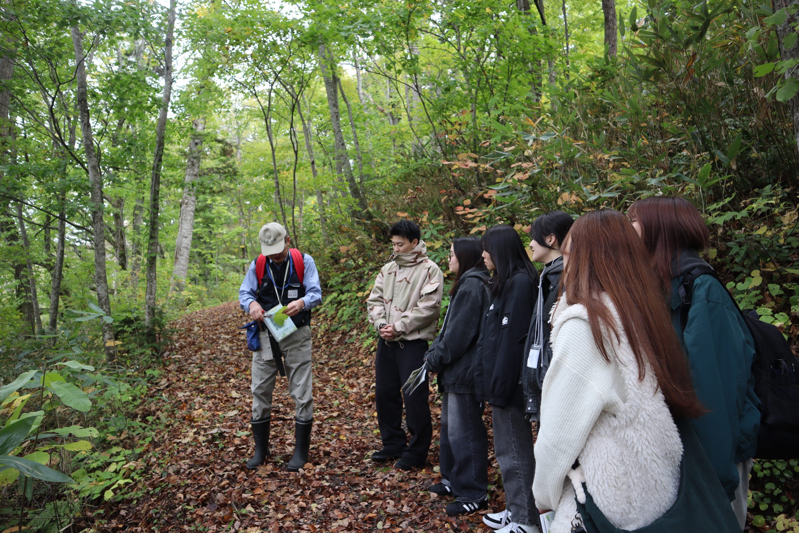 当別町にあるキャンプ施設「道民の森」(神居尻地区)で自然を感じながら夜を明かし、翌日は、森の案内人と呼ばれるガイドさんが、森の中を散歩しながら様々な植物についての知識を教えてくれる「森の観測会」に参加しました。学生達は、興味津々でガイドさんの話を聞いていました。