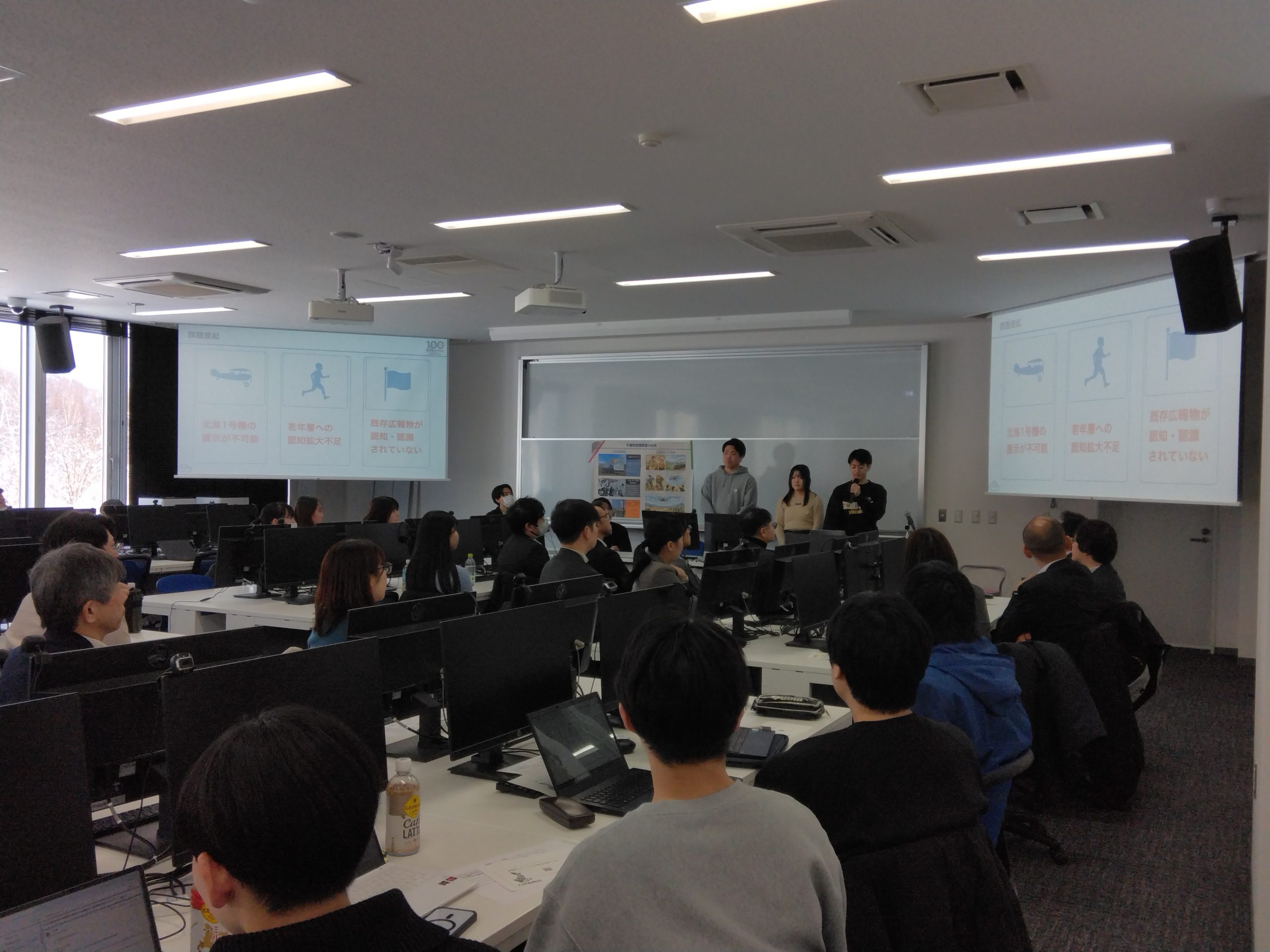 千歳市では、「北海1号機」が千歳着陸場に飛来してから2026年で100年を迎えることを記念して、「千歳市空港開港100年事業」を実施しています。学生たちは、その事業における現状の課題を探るため、千歳市担当者へのインタビューやまちライブラリー、学内でのアンケート調査を実施し、調査の結果「北海1号機」の展示が不可能であることや若年層への認知拡大不足などの課題が挙げられました。